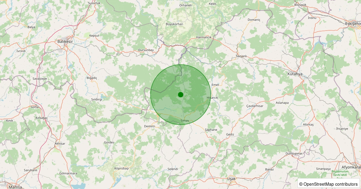 Son 7 gün içinde Simav - Karakoca Köyü noktasından 100 km yarıçap içerisinde meydana gelen diğer depremler: