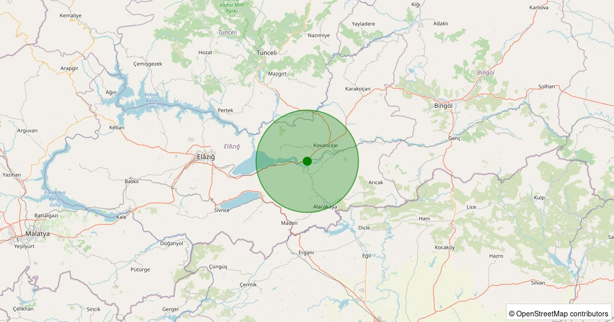Son 7 gün içinde Kovancılar - Yarımca Köyü noktasından 100 km yarıçap içerisinde meydana gelen diğer depremler: