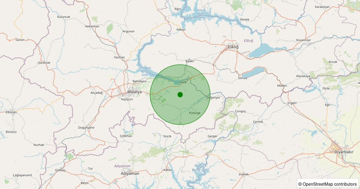 Son 7 gün içinde Pütürge - Pazarcık Köyü noktasından 100 km yarıçap içerisinde meydana gelen diğer depremler: