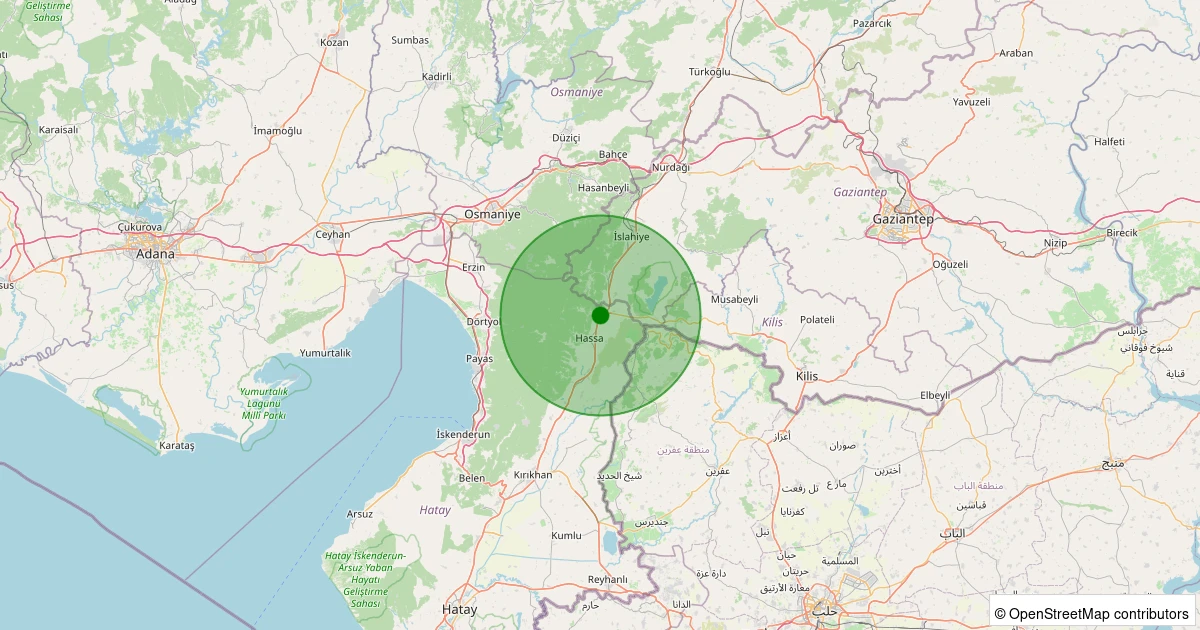 Son 7 gün içinde Hassa - Akbez Köyü noktasından 100 km yarıçap içerisinde meydana gelen diğer depremler: