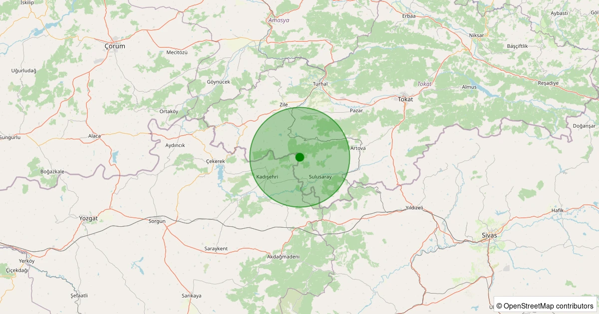 Son 7 gün içinde Sulusaray - Tekkeyeni Köyü noktasından 100 km yarıçap içerisinde meydana gelen diğer depremler: