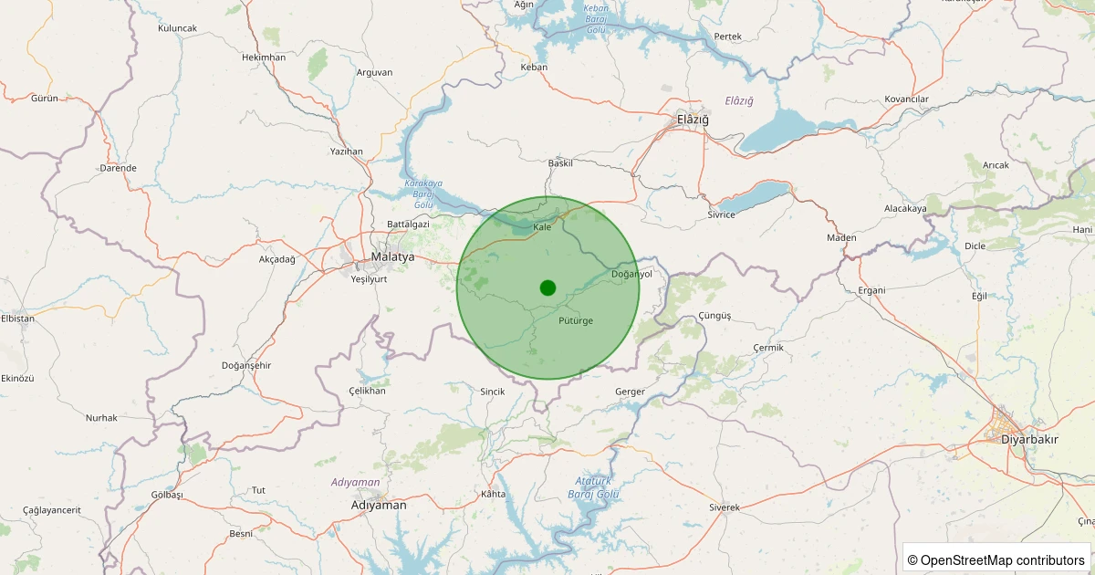 Son 7 gün içinde Pütürge - Pazarcık Köyü noktasından 100 km yarıçap içerisinde meydana gelen diğer depremler: