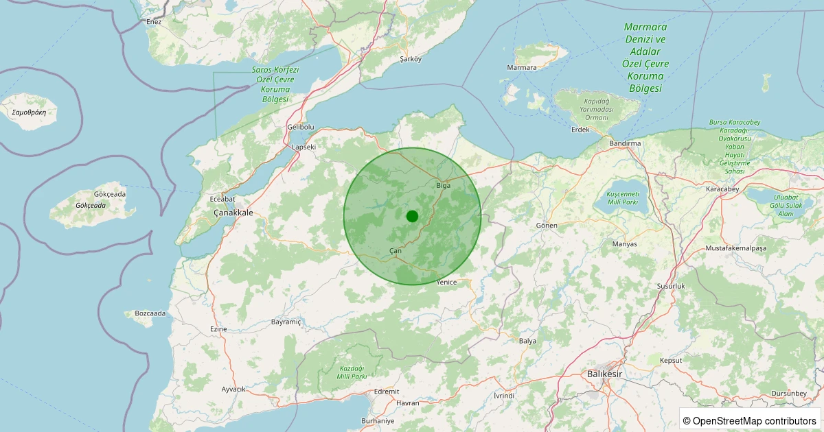 Son 7 gün içinde Biga - Dikmen Köyü noktasından 100 km yarıçap içerisinde meydana gelen diğer depremler: