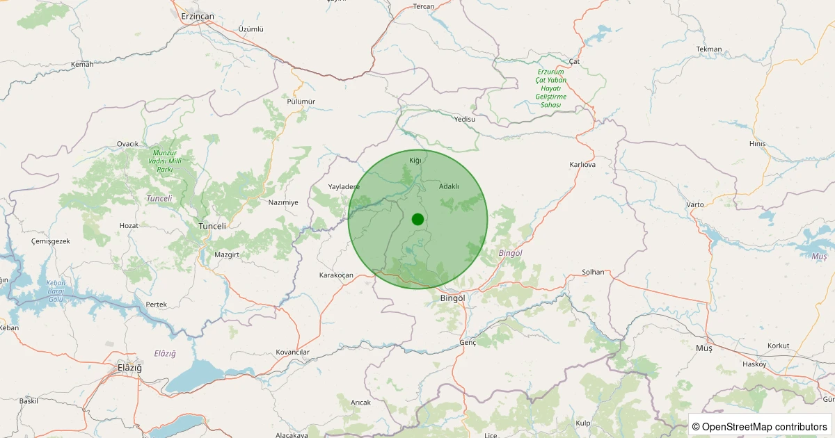 Son 7 gün içinde Kiğı - Sırmaçek Köyü noktasından 100 km yarıçap içerisinde meydana gelen diğer depremler: