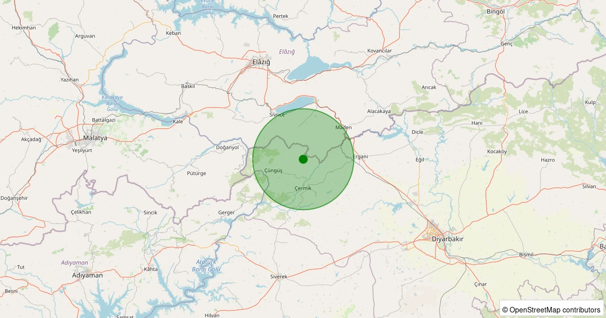 Son 7 gün içinde Çüngüş - Polatuşağı Köyü noktasından 100 km yarıçap içerisinde meydana gelen diğer depremler: