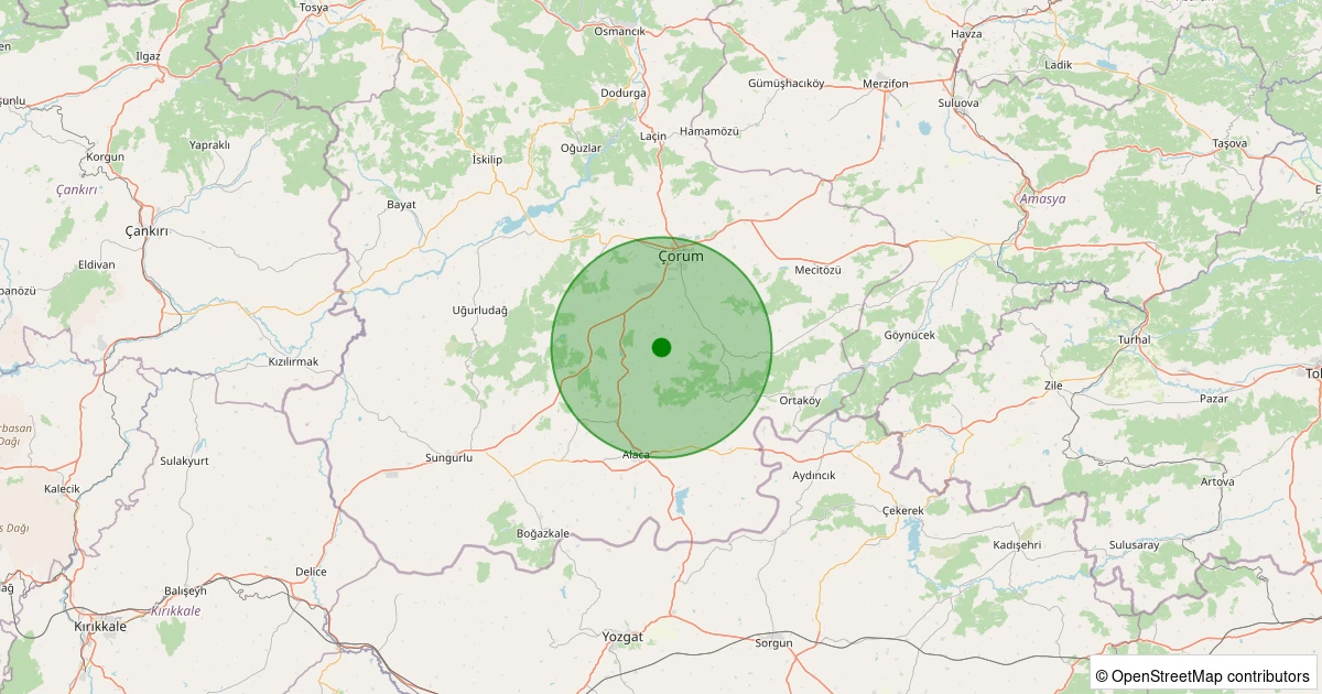 Son bir hafta içerisinde Çorum şehri Merkez noktasından 100 km yarıçap içerisinde toplamda 12 deprem kaydedilmiştir. Bu depremlerden en büyüğü 1.5 büyüklüğünde ve en sığ odaklısı 6.30 kilometre derinlikte gerçekleşmiştir.