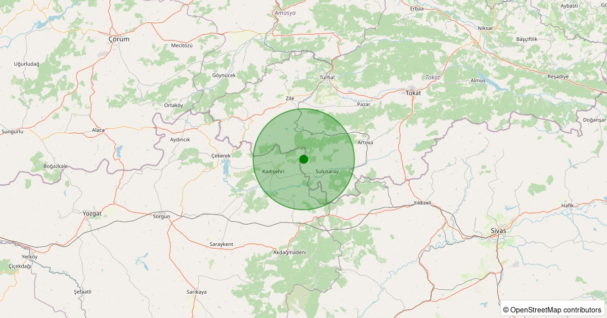 Son 7 gün içinde Kadışehri - E.Çiftliği Köyü noktasından 100 km yarıçap içerisinde meydana gelen diğer depremler: