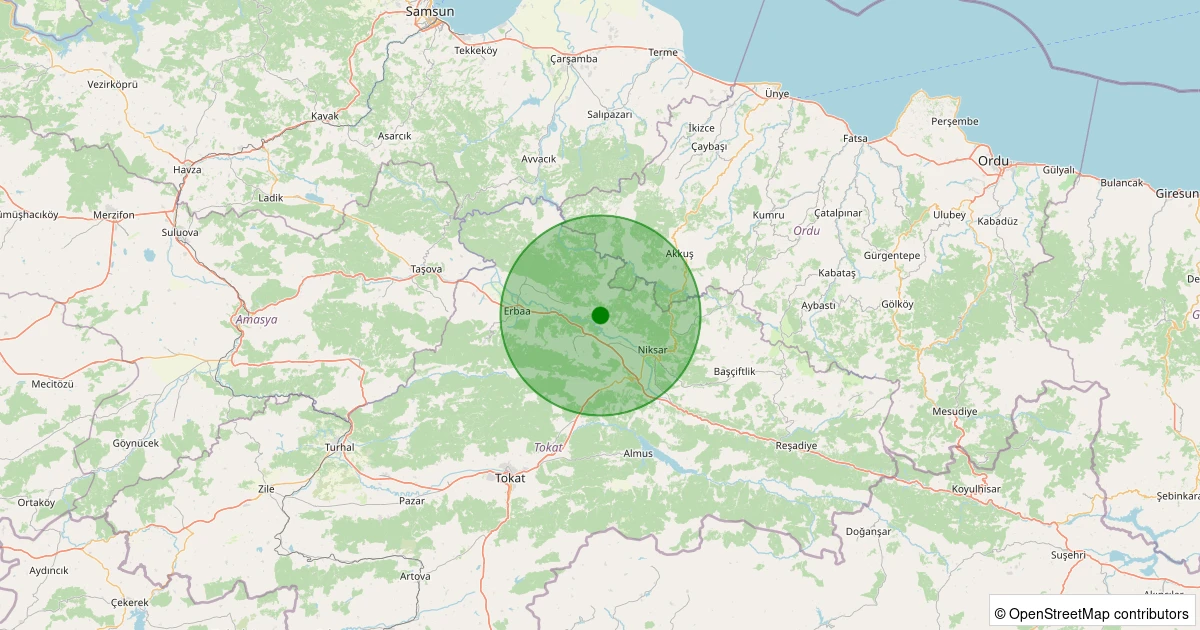 Son 7 gün içinde Erbaa - Pınarbeyli Köyü noktasından 100 km yarıçap içerisinde meydana gelen diğer depremler: