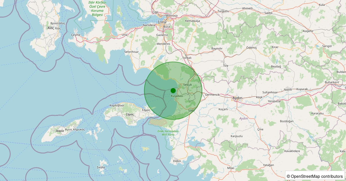 Son 7 gün içinde Ege Denizi - Kuşadası Körfezi - [05.29 km] Kuşadası (Aydın) noktasından 100 km yarıçap içerisinde meydana gelen diğer depremler: