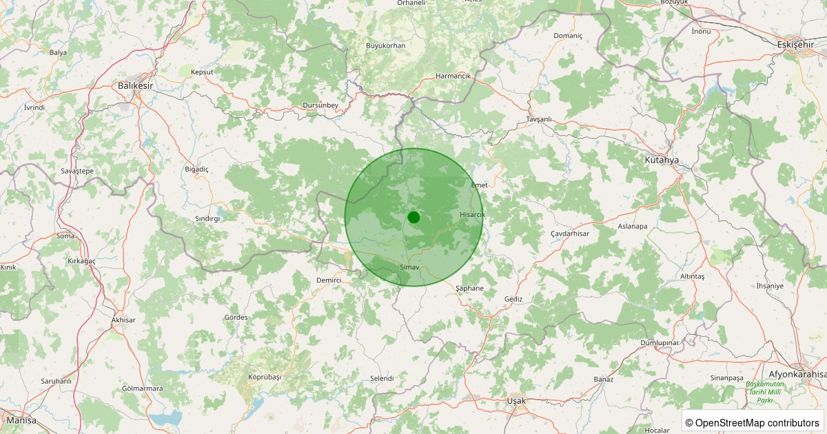 Son 7 gün içinde Simav - Yemişli Köyü noktasından 100 km yarıçap içerisinde meydana gelen diğer depremler: