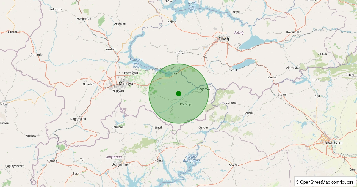 Son 7 gün içinde Pütürge - Aktarla Köyü noktasından 100 km yarıçap içerisinde meydana gelen diğer depremler: