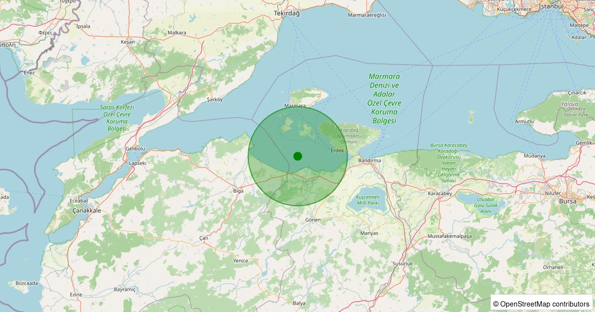 Son bir hafta içerisinde ERDEK noktasından 100 km yarıçap içerisinde toplamda 25 deprem kaydedilmiştir. Bu depremlerden en büyüğü 3.3 büyüklüğünde ve en sığ odaklısı 5.20 kilometre derinlikte gerçekleşmiştir.
