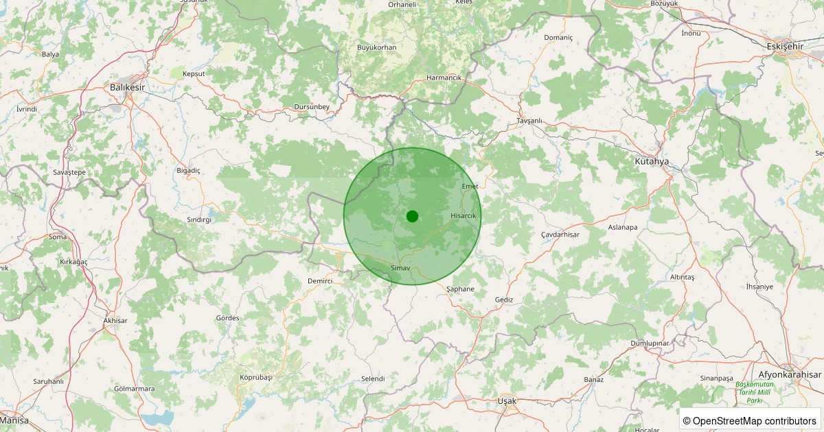 Son 7 gün içinde Simav - Yeşildere Köyü noktasından 100 km yarıçap içerisinde meydana gelen diğer depremler: