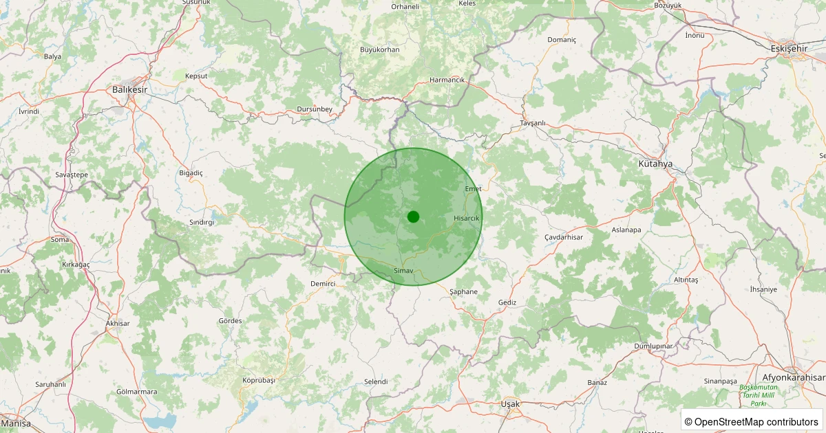 Son 7 gün içinde Simav - Yeşildere Köyü noktasından 100 km yarıçap içerisinde meydana gelen diğer depremler: