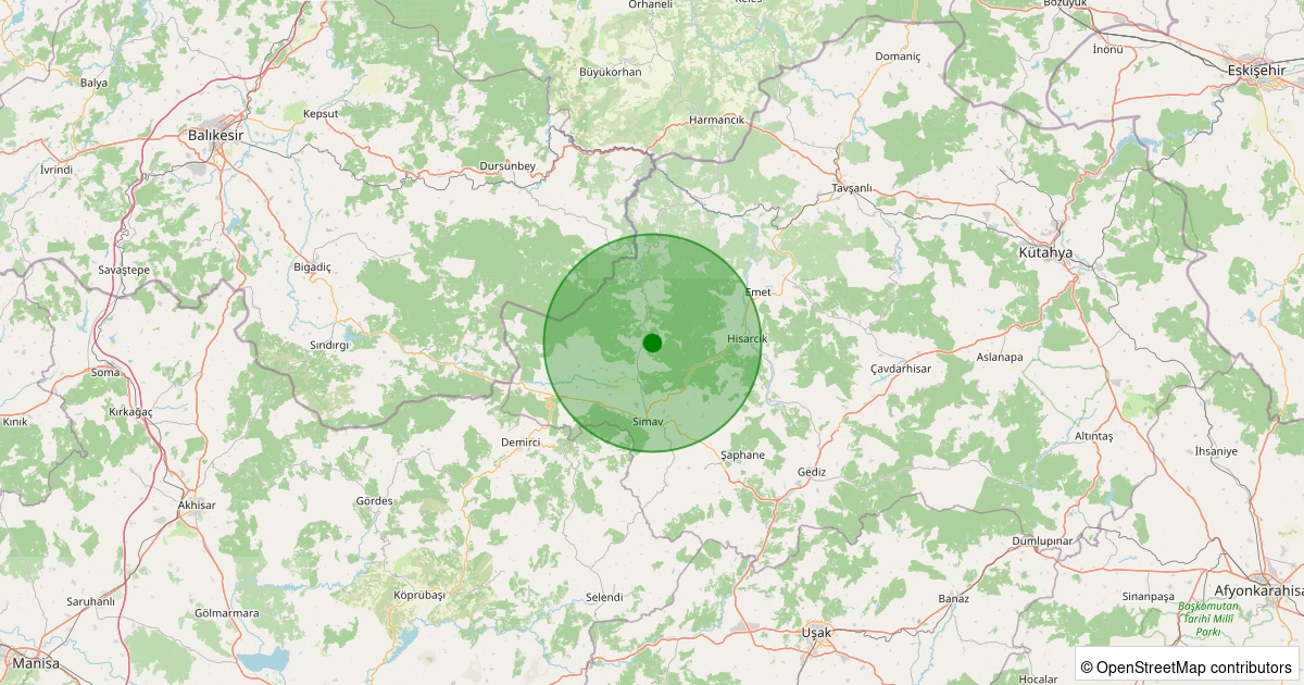 Son 7 gün içinde Simav - Yemişli Köyü noktasından 100 km yarıçap içerisinde meydana gelen diğer depremler:
