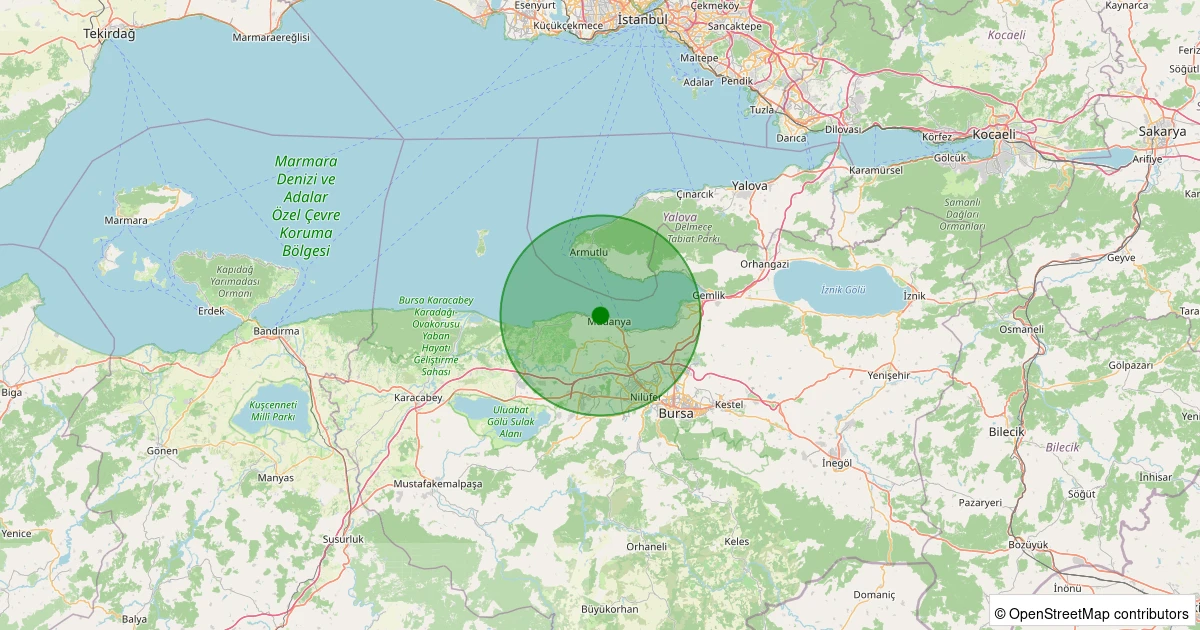 Son bir hafta içerisinde MUDANYA noktasından 100 km yarıçap içerisinde toplamda 36 deprem kaydedilmiştir. Bu depremlerden en büyüğü 2.6 büyüklüğünde ve en sığ odaklısı 0.00 kilometre derinlikte gerçekleşmiştir.