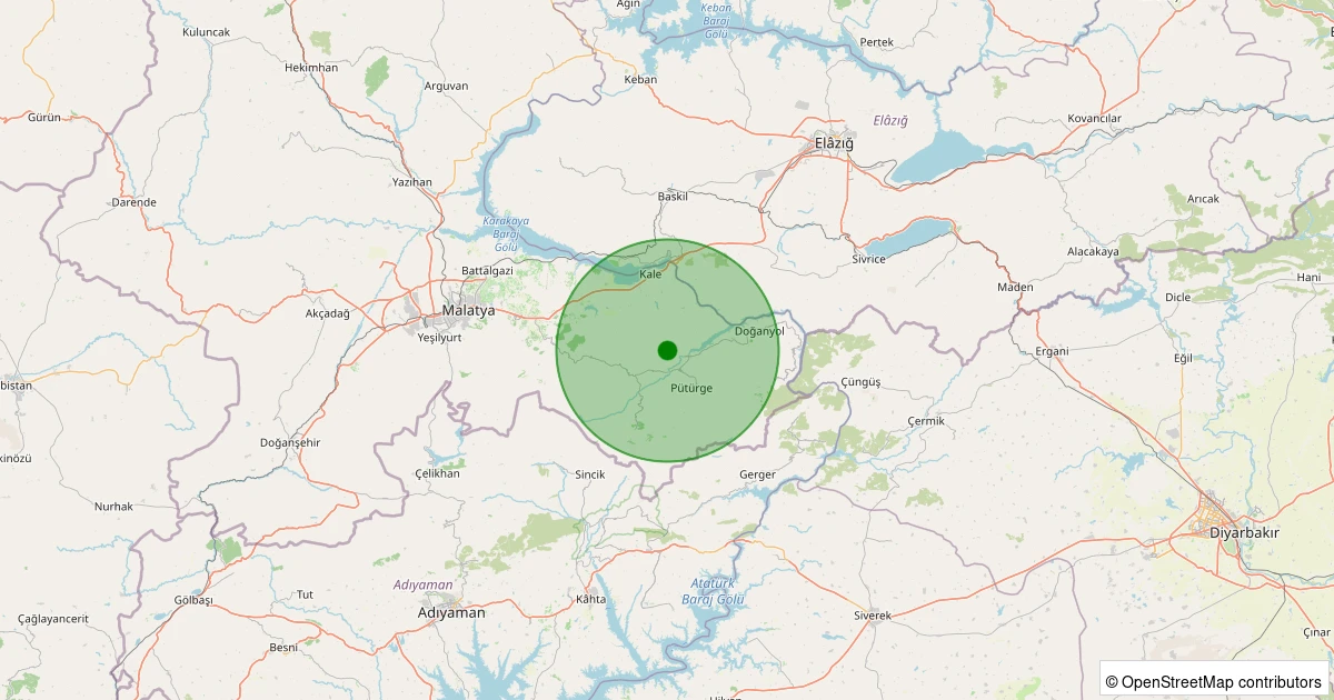 Son 7 gün içinde Pütürge - Aktarla Köyü noktasından 100 km yarıçap içerisinde meydana gelen diğer depremler: