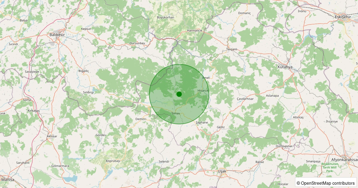 Son 7 gün içinde Simav - Yemişli Köyü noktasından 100 km yarıçap içerisinde meydana gelen diğer depremler: