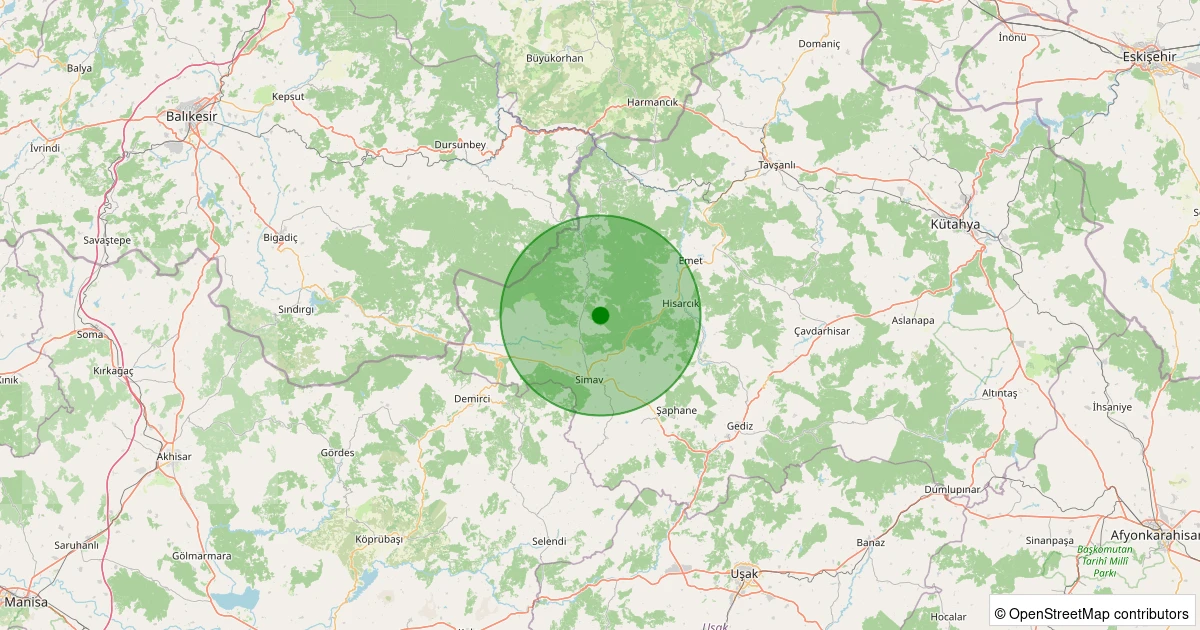 Son 7 gün içinde Simav - Yemişli Köyü noktasından 100 km yarıçap içerisinde meydana gelen diğer depremler: