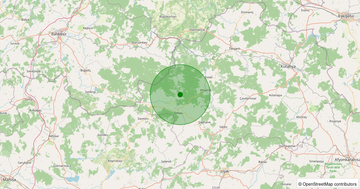 Son 7 gün içinde Simav - Yemişli Köyü noktasından 100 km yarıçap içerisinde meydana gelen diğer depremler: