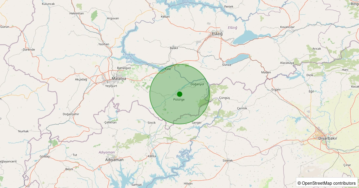 Son 7 gün içinde Pütürge - Örmeli Köyü noktasından 100 km yarıçap içerisinde meydana gelen diğer depremler: