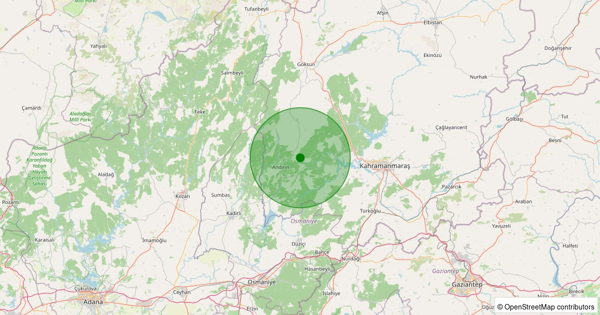 Son 7 gün içinde Andırın - Emirler Köyü noktasından 100 km yarıçap içerisinde meydana gelen diğer depremler: