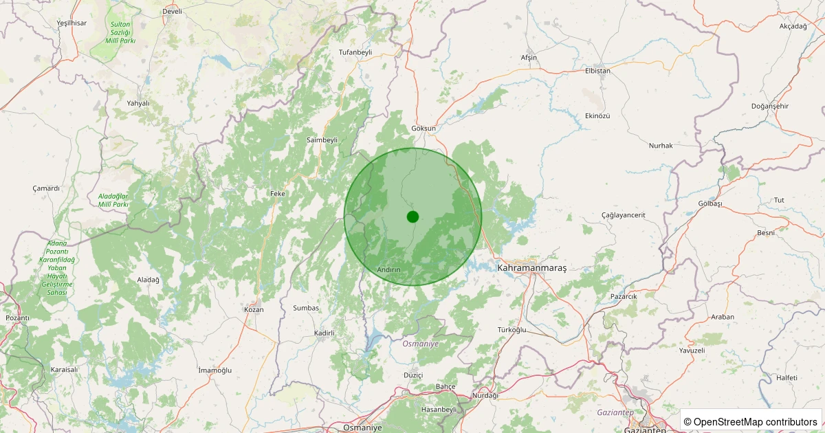 Son 7 gün içinde Andırın - Geben Köyü noktasından 100 km yarıçap içerisinde meydana gelen diğer depremler: