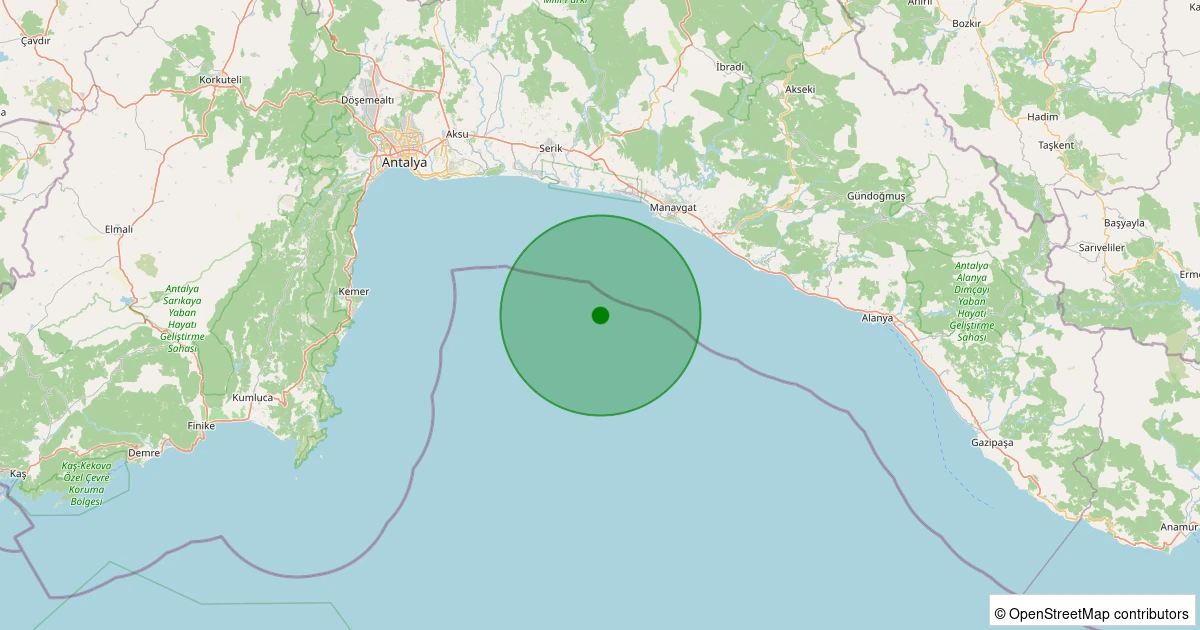 Son bir hafta içerisinde Akdeniz - Antalya Körfezi - [29.21 km] Manavgat (Antalya) noktasından 100 km yarıçap içerisinde toplamda 28 deprem kaydedilmiştir. Bu depremlerden en büyüğü 3.2 büyüklüğünde ve en sığ odaklısı 5.40 kilometre derinlikte gerçekleşmiştir.