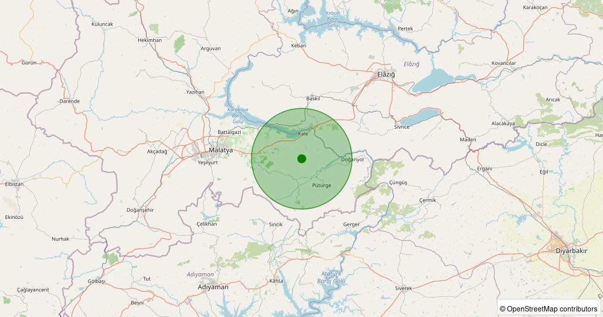 Son 7 gün içinde Pütürge - Pazarcık Köyü noktasından 100 km yarıçap içerisinde meydana gelen diğer depremler: