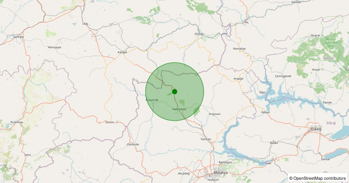 Son 7 gün içinde Hekimhan - Hasançelebi Köyü noktasından 100 km yarıçap içerisinde meydana gelen diğer depremler: