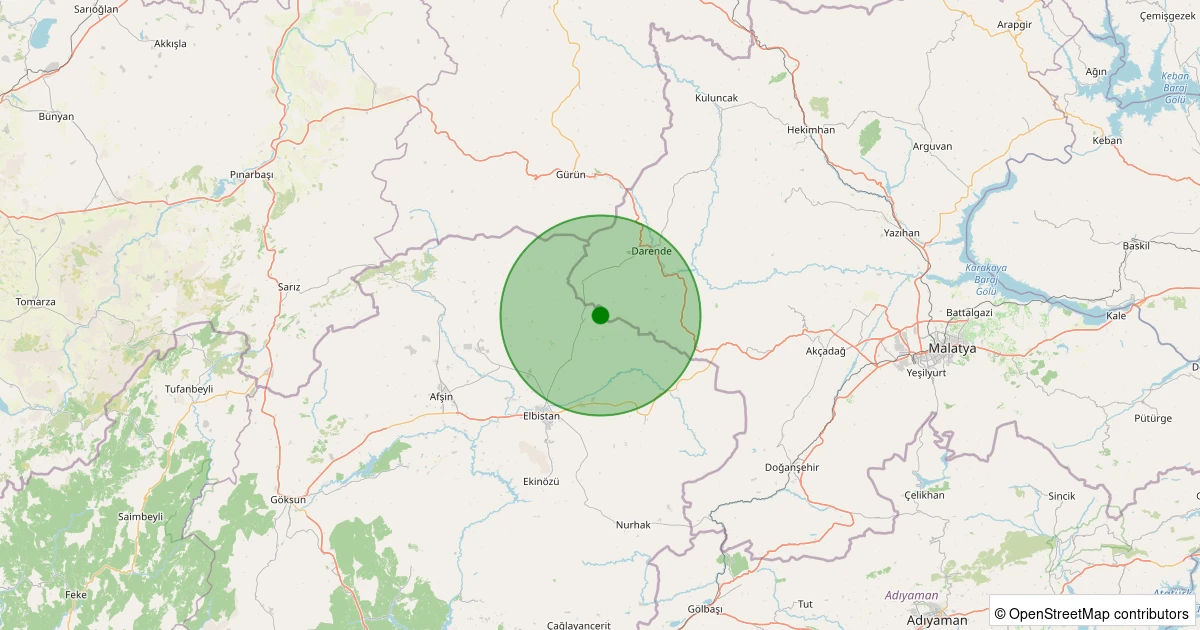 Son 7 gün içinde Elbistan - Büyük Yapalak Köyü noktasından 100 km yarıçap içerisinde meydana gelen diğer depremler: