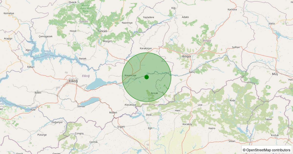 Son 7 gün içinde Palu - Damlapınar Köyü noktasından 100 km yarıçap içerisinde meydana gelen diğer depremler: