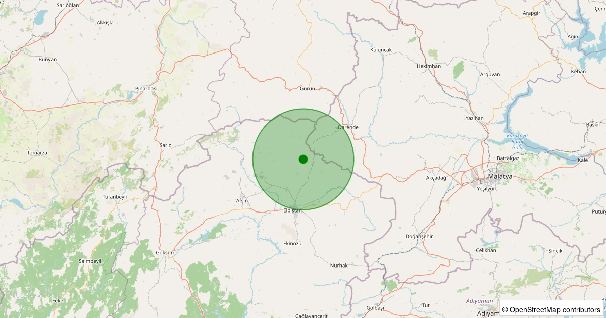 Son 7 gün içinde Elbistan - Gökcek Köyü noktasından 100 km yarıçap içerisinde meydana gelen diğer depremler: