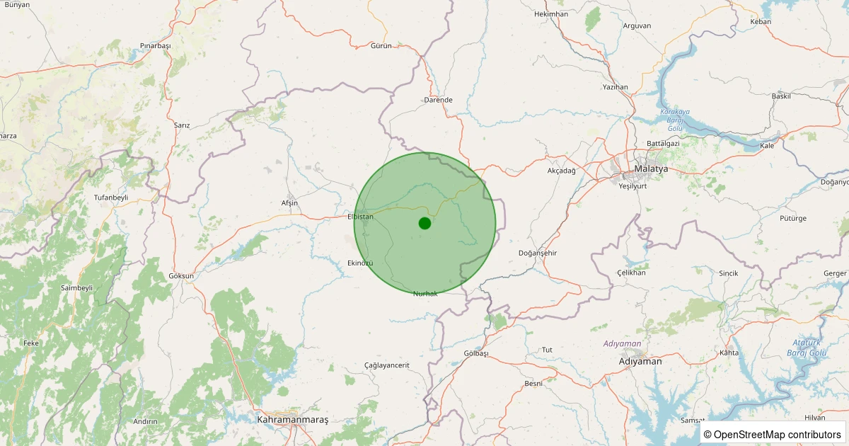 Son 7 gün içinde Elbistan - Tepebaşı(Kastal) Köyü noktasından 100 km yarıçap içerisinde meydana gelen diğer depremler: