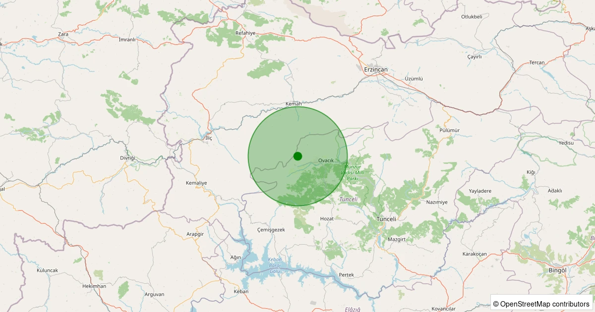 Son 7 gün içinde Ovacık - Yeşilyazı Köyü noktasından 100 km yarıçap içerisinde meydana gelen diğer depremler: