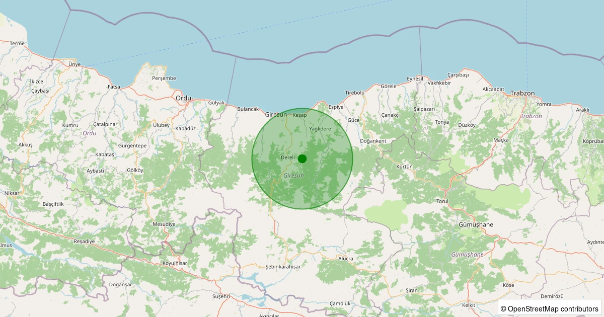 Son 7 gün içinde Dereli - Eğrianbar Köyü noktasından 100 km yarıçap içerisinde meydana gelen diğer depremler: