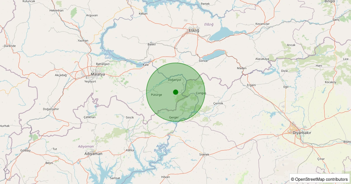 Son 7 gün içinde Pütürge - Yamaç Köyü noktasından 100 km yarıçap içerisinde meydana gelen diğer depremler: