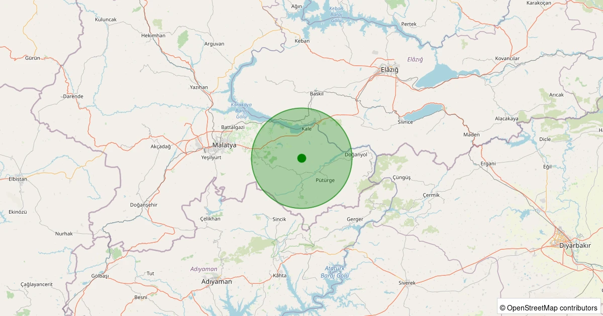 Son 7 gün içinde Pütürge - Pazarcık Köyü noktasından 100 km yarıçap içerisinde meydana gelen diğer depremler: