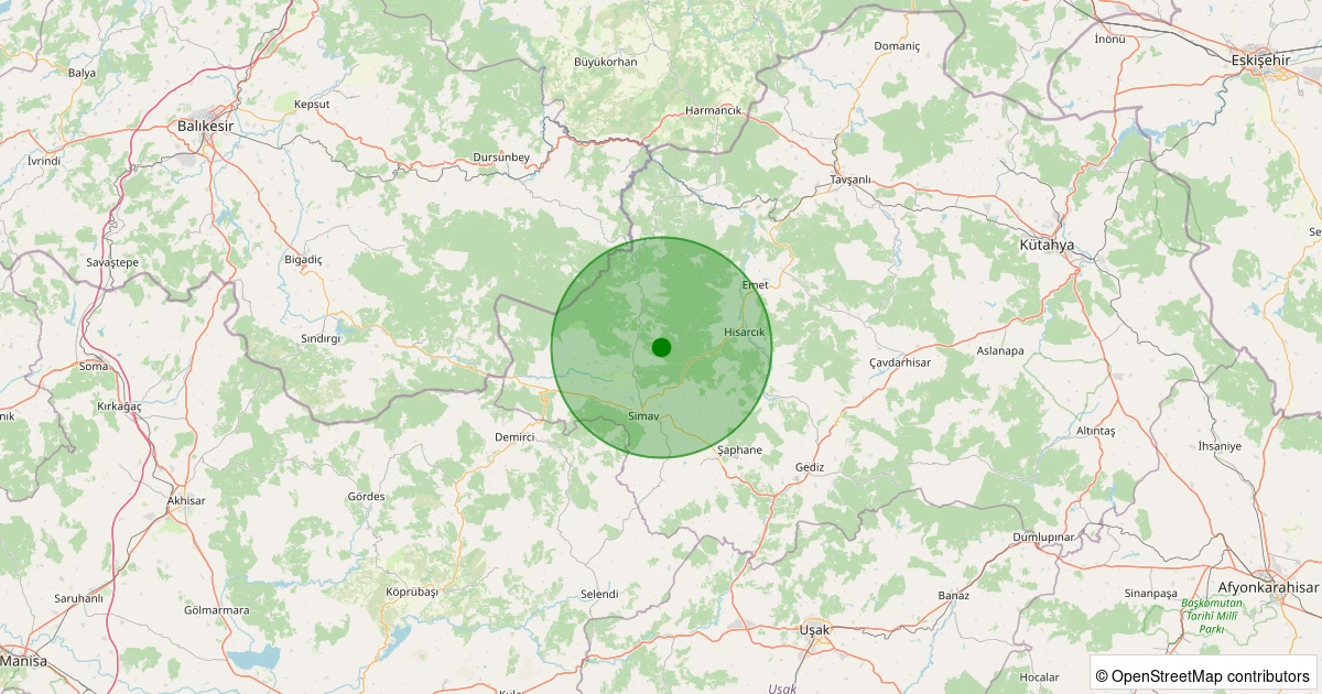 Son 7 gün içinde Simav - Yemişli Köyü noktasından 100 km yarıçap içerisinde meydana gelen diğer depremler: