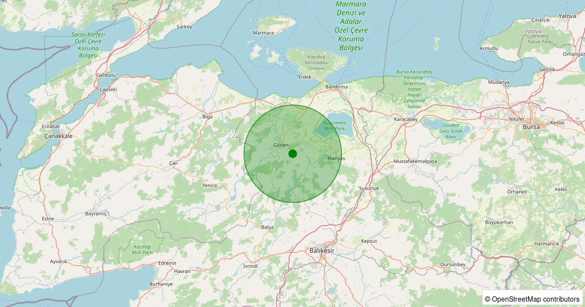 Son 7 gün içinde Gönen - Tütüncü noktasından 100 km yarıçap içerisinde meydana gelen diğer depremler: