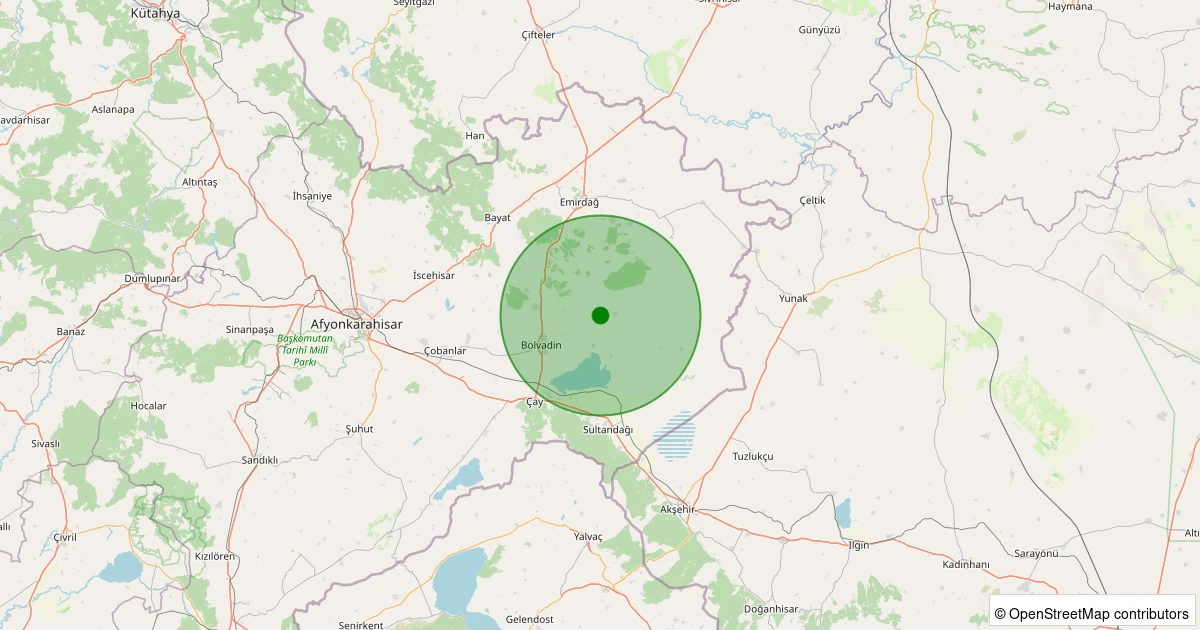 Son bir hafta içerisinde Afyonkarahisar şehri Bolvadin - Büyükkarabağ/Hacıbekir Köyü noktasından 100 km yarıçap içerisinde toplamda 17 deprem kaydedilmiştir. Bu depremlerden en büyüğü 1.7 büyüklüğünde ve en sığ odaklısı 6.00 kilometre derinlikte gerçekleşmiştir.