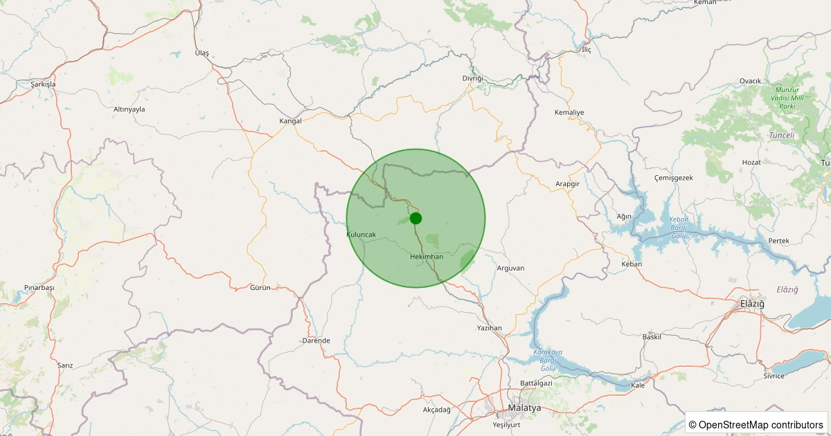 Son 7 gün içinde Hekimhan - Davulku Köyü noktasından 100 km yarıçap içerisinde meydana gelen diğer depremler: