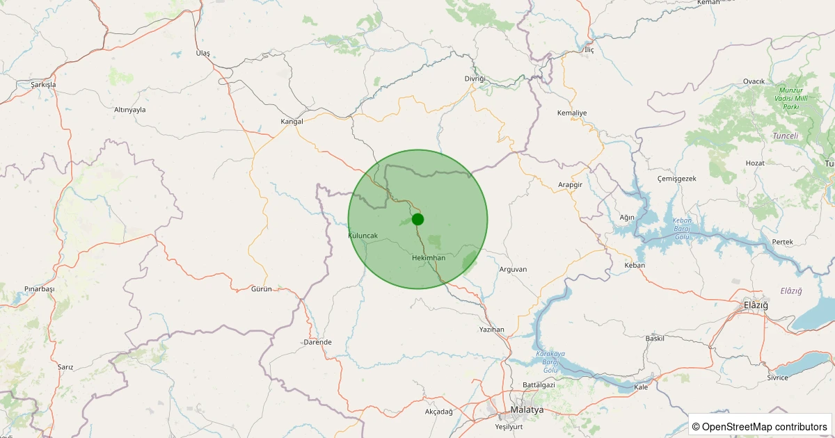 Son 7 gün içinde Hekimhan - Hasançelebi Köyü noktasından 100 km yarıçap içerisinde meydana gelen diğer depremler: