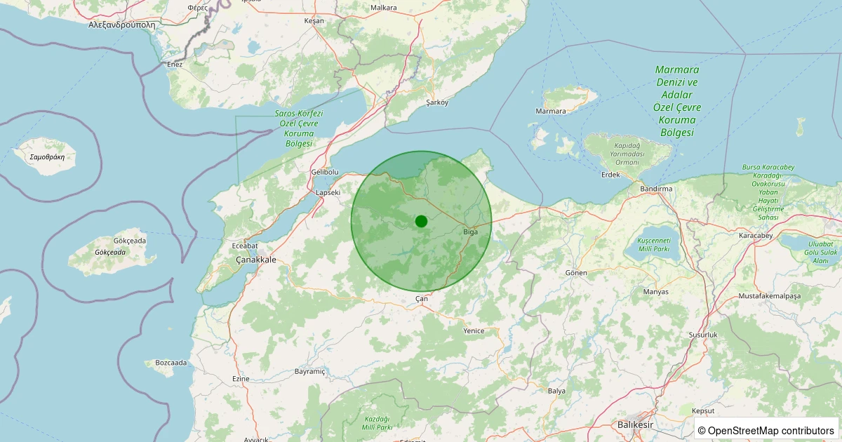Son 7 gün içinde Biga - Kozçeşme Köyü noktasından 100 km yarıçap içerisinde meydana gelen diğer depremler: