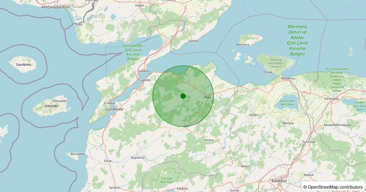 Son 7 gün içinde Biga - Kozçeşme Köyü noktasından 100 km yarıçap içerisinde meydana gelen diğer depremler: