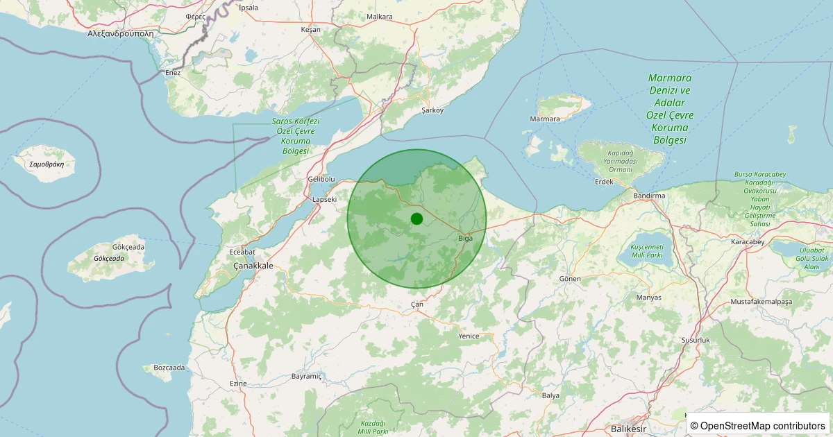 Son 7 gün içinde Biga - Hisarlı Köyü noktasından 100 km yarıçap içerisinde meydana gelen diğer depremler: