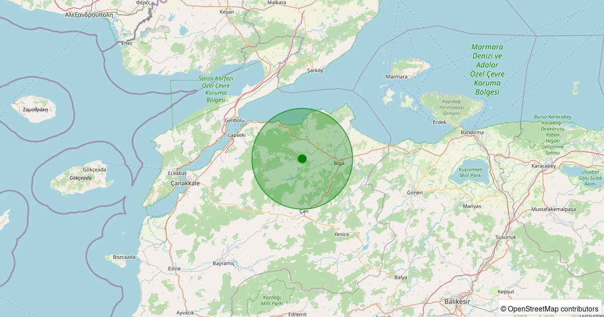 Son 7 gün içinde Biga - Kozçeşme Köyü noktasından 100 km yarıçap içerisinde meydana gelen diğer depremler: