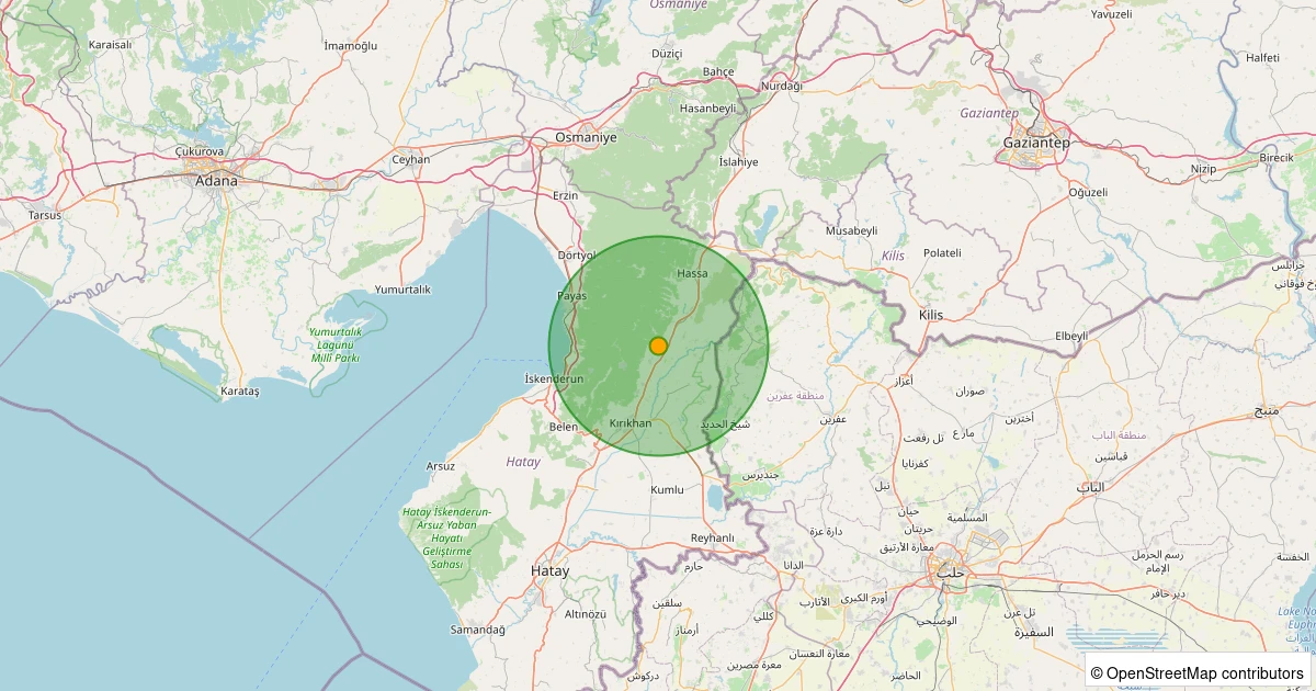 Son 7 gün içinde Kırıkhan - Bektaşlı Köyü noktasından 100 km yarıçap içerisinde meydana gelen diğer depremler: