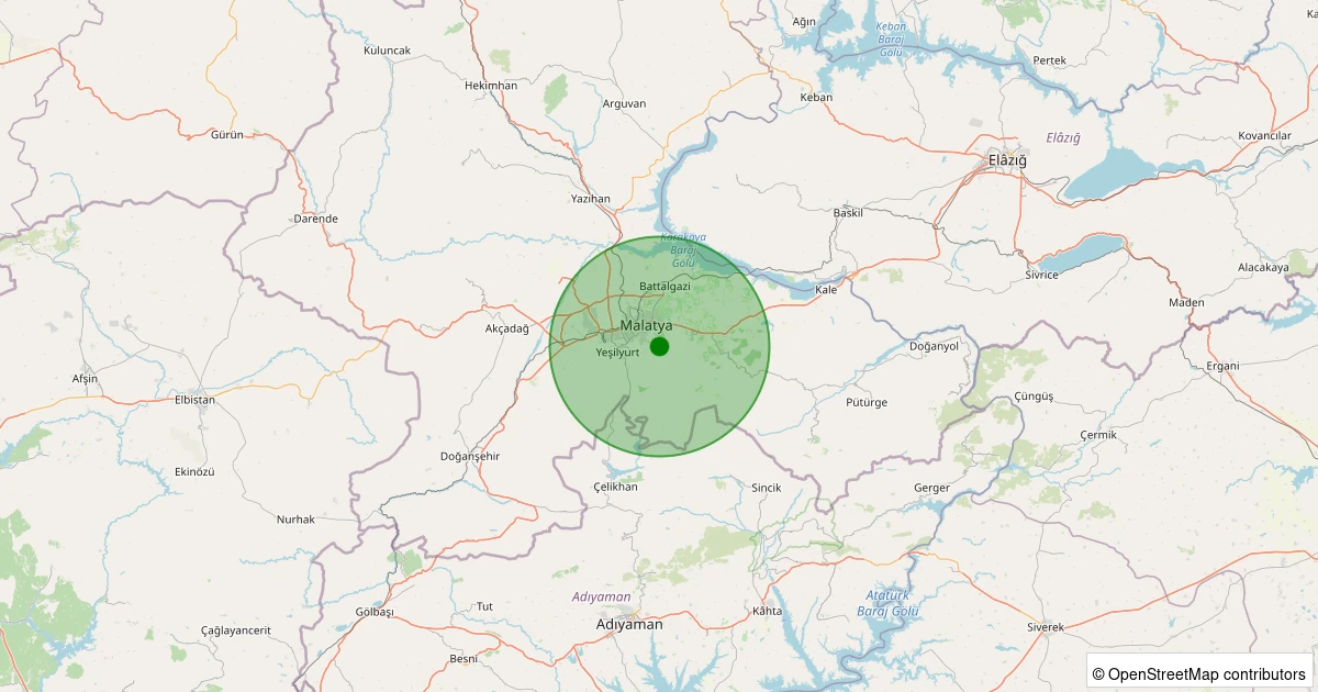 Son 7 gün içinde Battalgazi - Çamurlu Köyü noktasından 100 km yarıçap içerisinde meydana gelen diğer depremler: