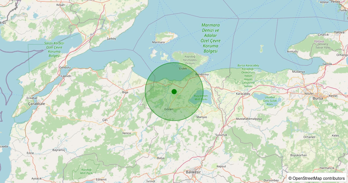 Son 7 gün içinde Gönen - Bostancı noktasından 100 km yarıçap içerisinde meydana gelen diğer depremler: